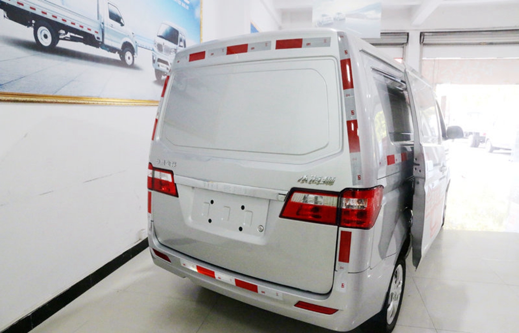 廂貨版的車尾也是采用了封閉式的后窗并且用3M反光警示條進行了勾勒,整體造型方方正正的,依舊是面包車的經(jīng)典姿態(tài)。
