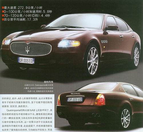 Quattroporte的特點(diǎn)就與A8 L完全不同了,流線動(dòng)感的前臉?biāo)坪蹙驮诎凳臼裁础<で樵谖覀儾扔烷T的一瞬就在澎湃,5米長的車身和2噸多的重量在行駛中好像化為烏有。這一切要?dú)w功于它完美的底盤調(diào)校和平衡的車重,在此前提下,外形笨重的轎車也具有了豪華跑車的特性。它的轉(zhuǎn)向不僅有力,而且及時(shí)精確,此外對(duì)線路的調(diào)整也很準(zhǔn)確。在Sport擋下,變速箱反應(yīng)很好,它能把V8發(fā)動(dòng)機(jī)的轉(zhuǎn)速提高到7500轉(zhuǎn)/分鐘。