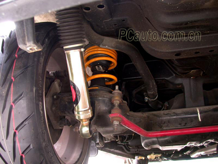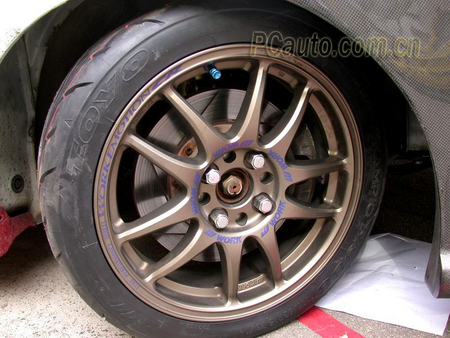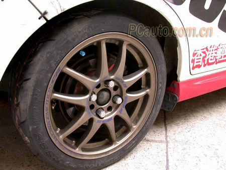 要在各方面達(dá)到賽車水平,一套優(yōu)良的制動系統(tǒng)是不可缺少的,首先這臺YRV的前制動換上一套大型的分泵和大直徑的分體式開坑剎車碟,剎車皮自然使用的是高溫度的競技版本。至于后輪部分,原裝的YRV只是采用鼓式制動,車主為滿足競技的需求,換上了整套的碟式制動系統(tǒng),并配以CROSS的高溫剎車皮。