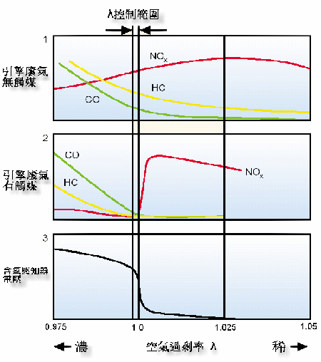 然而觸媒轉(zhuǎn)化器的使用條件相當(dāng)嚴(yán)苛,除了須達到較高工作溫度外,最重要的是它的最大凈化率是發(fā)生在理論混合比附近(14.7:1)如上圖,也就是說引擎的燃燒須控制在14.7:1 空燃混合之下,要達到此細微之標(biāo)準(zhǔn)并不容易,所以才藉由氧傳感器的作用將空燃比轉(zhuǎn)換成數(shù)據(jù)供給引擎計算機進而調(diào)整到理論范圍,稍后也將述說到引擎計算機如何利用含氧感知的訊號來作回饋的作用,使其空燃比維持在14.7:1附近。