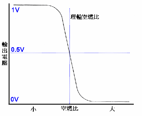 內(nèi)層白金面所大氣接觸,所以氧氣濃度高,外層白金與排氣接觸,氧氣濃度低。當(dāng)混合比較高時(shí),排放的廢氣所含的氧相對(duì)地減少,因此氧化鋯兩側(cè)的白金所接觸到的氧氣高低落差大,所產(chǎn)生的電動(dòng)勢(shì)也相對(duì)高(將近1V);當(dāng)混合比稀時(shí),燃燒完所多余的氧氣較多,氧化鋯兩側(cè)的白金層的氧氣落差小,因此所產(chǎn)生的電動(dòng)勢(shì)低(將近0V)。由上述的情形可得到下圖表