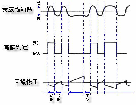 一般氧化鋯型氧傳感器有個(gè)特性,就是當(dāng)λ=1時(shí)電壓反應(yīng)較為急遽,利用這個(gè)特性可作為濃與稀的分界而形成兩段式控制(Two-step Control),當(dāng)引擎計(jì)算機(jī)接收到此電壓時(shí)是屬于模擬訊號(hào),經(jīng)模擬數(shù)字轉(zhuǎn)換大致可得到紅色虛線的數(shù)字訊號(hào),計(jì)算機(jī)即可判斷出混合比的濃與稀,分別以1與0來表示,當(dāng)數(shù)字訊號(hào)為1時(shí)作出減量控制,也就是減少噴油量;當(dāng)訊號(hào)為0時(shí)作出增量控制,如下圖
