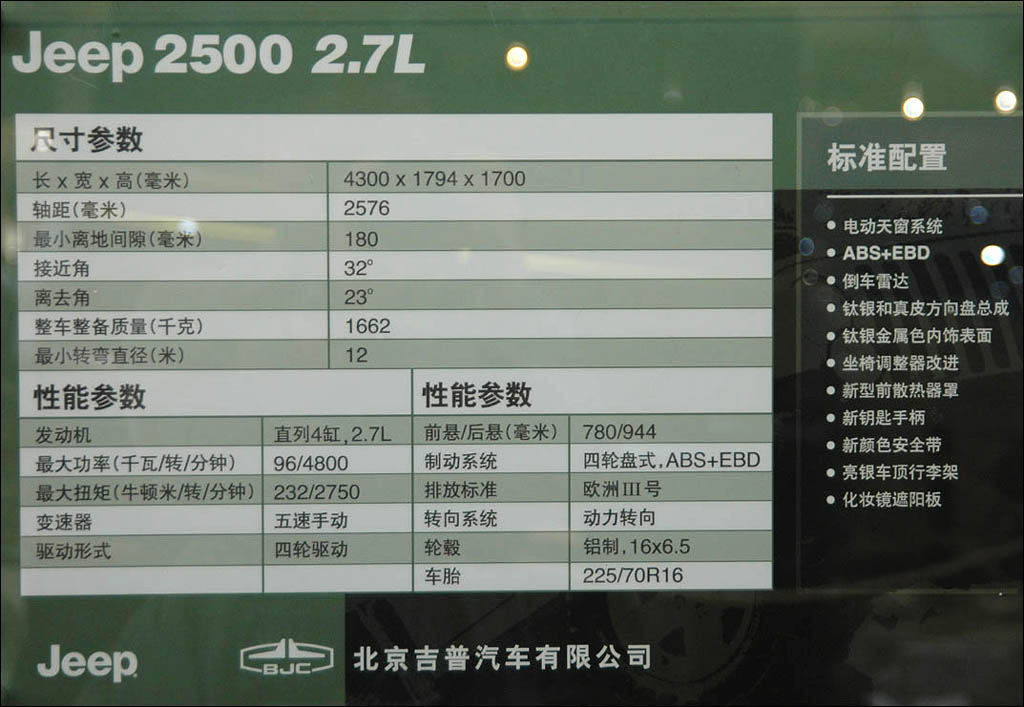 在今年的上海車展上,北京吉普展出了裝備2.7L發(fā)動機(jī)的2500。目前此款車已經(jīng)正式更名為JEEP2700,并將在近日上市銷售,目前公司內(nèi)部正在為其進(jìn)行上市前最后的準(zhǔn)備工作。