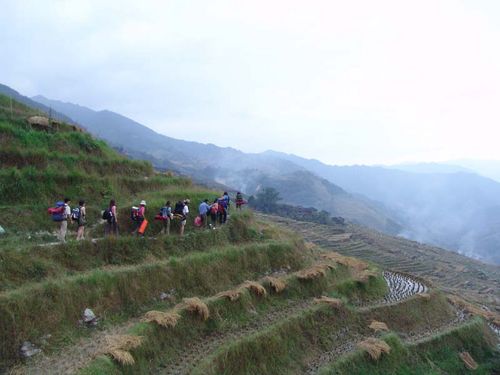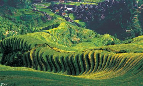 出行前,有驢友再三推薦到廣西后一定要去龍脊梯田看一看。我當時不以為然,因為自小生長在高原,梯田隨處可見,實在不足為奇。哪料到桂林后,偶爾在玻璃櫥窗里看到龍脊梯田的四季攝影圖片展,帶給我的不僅是視覺上的沖擊,更是心靈上的震撼。龍脊梯田屬于水田,而且線條精細,春季灌溉時猶如面面銀鏡,夏季抽苗時好似層層綠波,秋季稻熟時仿佛條條金鏈,冬季飄雪時完若環(huán)環(huán)白玉,一年四景皆妙不可言。